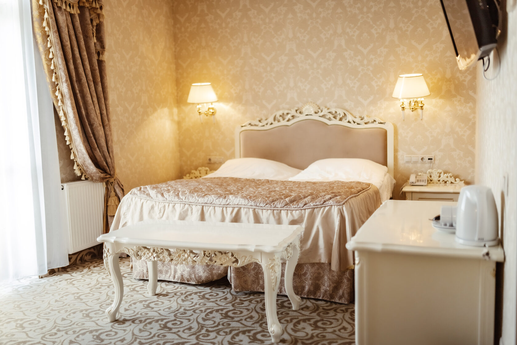 Номери всіх категорій обладнані зручними меблями, двоспальним ліжком або 2 окремих, міні-баром, сейфом, телефоном, санвузлом.